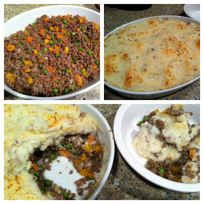 Back to the cottage pie. So, many people know Shepherd's Pie - ground lamb with onions, carrots, and peas topped with cheesy mashed potatoes and baked in the oven. Well, cottage pie is the same idea, just using beef instead of lamb.